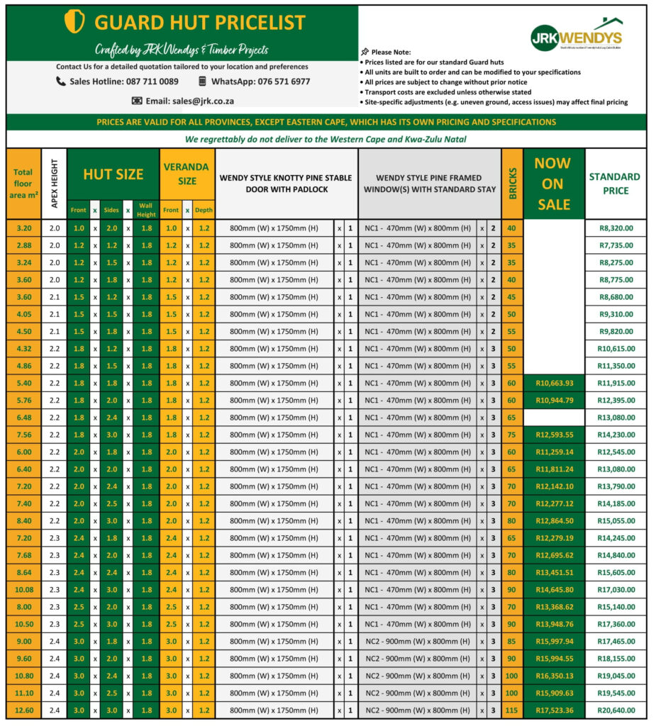Please note that we do not deliver Wendy Huts, Tool Sheds, Guard Huts, or similar units to the Eastern Cape, KwaZulu-Natal, or Western Cape. Delivery to these regions is only available for our large Log Cabin Homes.