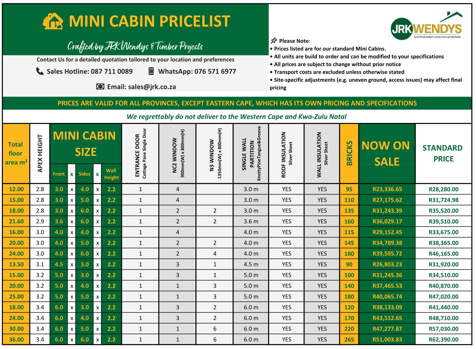 Please note that we do not deliver Wendy Huts, Tool Sheds, Mini Cabins, Guard Huts, or similar units to the Eastern Cape, KwaZulu-Natal, or Western Cape. Delivery to these regions is only available for our large Log Cabin Homes.