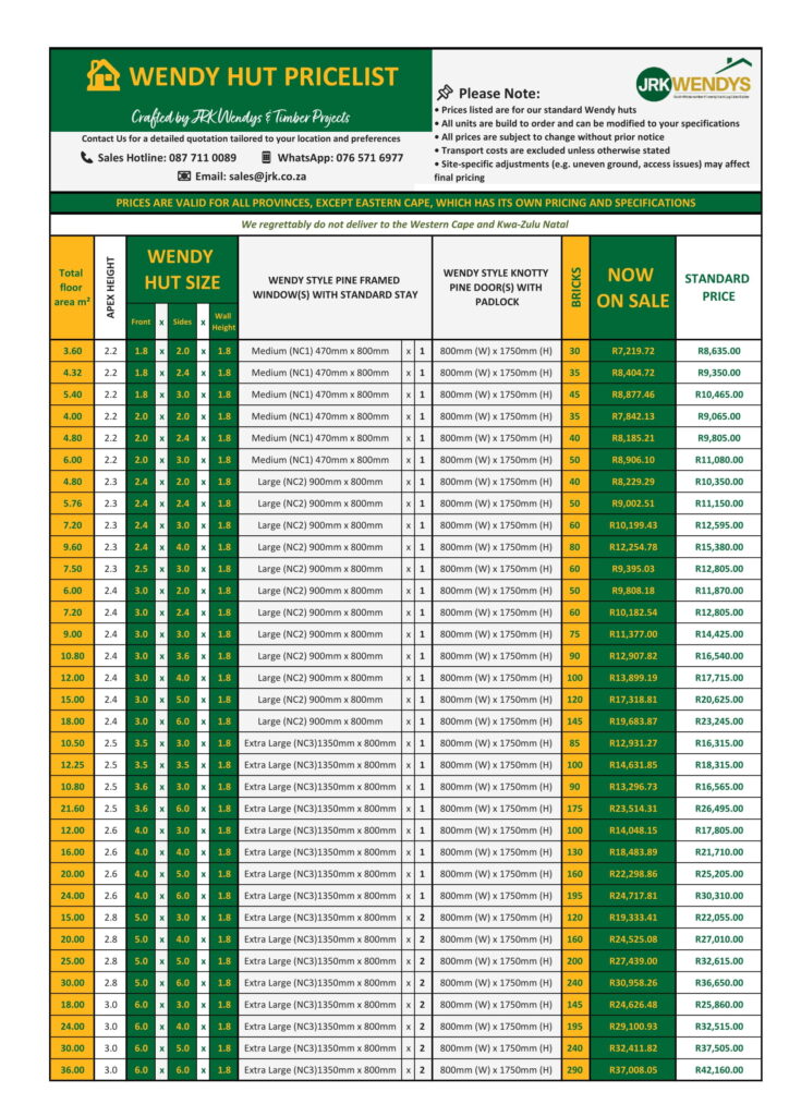 Please note that we do not deliver Wendy Huts, Mini Cabins, Tool Sheds, Guard Huts, or similar units to the Eastern Cape, KwaZulu-Natal, or Western Cape. Delivery to these regions is only available for our large Log Cabin Homes.